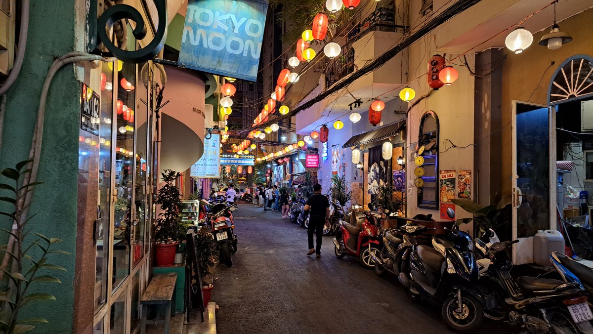 通りには赤い提灯が灯り、日本語の看板や居酒屋、日本食レストランが並び、日本とベトナムの文化が混ざり合った不思議な景色が広がります。ベトナム・ホーチミンでしか見られない独特の街並みでしょう。